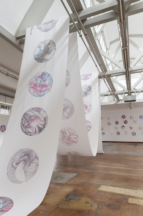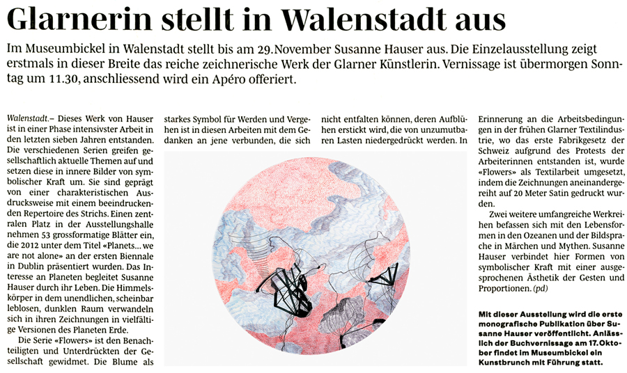 Die in Weesen lebende Susanne Hauser konzentriert sich in ihrer Arbeit seit 2009 auf das Zeichnen und hat dabei eine eigene Handschrift mit definierten formalen Bedingungen entwickelt. Einen zentralen Platz nimmt eine Serie von 53 grossformatigen Blättern ein, die sie unter dem Titel «Planets... we are not alone» an der Dublin Biennial 2012 präsentierte. In den Kreisflächen, die für Versionen von Planeten stehen, erforscht Susanne Hauser die unerschöpfliche Vielfalt von Strukturen, die durch Dichte und Richtung der Striche entstehen. Viele ihrer Arbeiten sind inspiriert von der Auseinandersetzung mit aktuellen gesellschaftlichen Themen, oder aber von der Beschäftigung mit Märchen und Mythen. Die Ausstellung schafft eine intensive Konstellation von zeichnerischen Welten, Visionen und Zeichen.