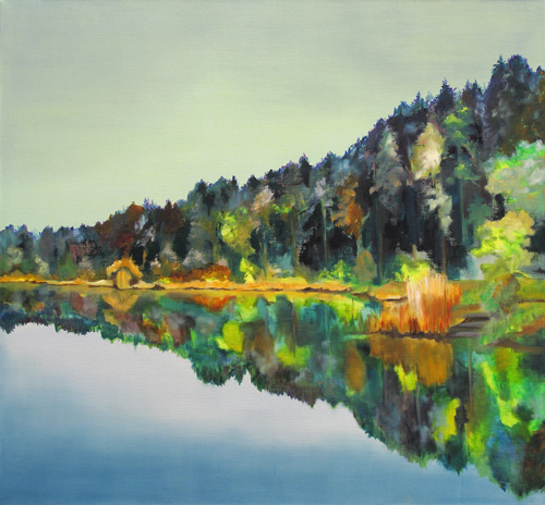 Spiegelung ist das zentrale Element in Bettina Mürners grossformatigem Werk See I–III. Die Uferlinie zieht sich über alle drei Bilder hinweg und bildet gleichzeitig die Achse des Spiegelbildes. Realität und Illusion von Raum, Konkretes und Abstraktes zeigen sich gleichzeitig. In ihren Ölbildern erweitert Bettina Mürner die konkrete Landschaft in eine ort- und zeitlose Erfahrung von Räumlichkeit. Diese subjektive Wahrnehmung wird von Farbstimmungen vermittelt, deren Intensität sich bei näherer Betrachtung erschliesst. Und wie Karl Bickel lenkt auch Bettina Mürner die Aufmerksamkeit in einigen Arbeiten von der weiten Landschaft auf die Pflanzenwelt am Boden oder auf einzelne Bäume.