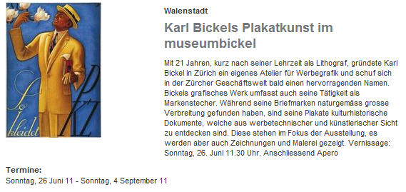 Bickels grafisches Werk umfasst auch seine Tätigkeit als Markenstecher. Während seine Briefmarken naturgemäss grosse Verbreitung gefunden haben und auch heute noch einen vertrauten Anblick bieten, sind seine Plakate kulturhistorische Dokumente, welche aus werbetechnischer und künstlerischer Sicht zu entdecken sind. Diese stehen im Fokus der Ausstellung, es werden aber auch Zeichnungen und Malerei gezeigt.